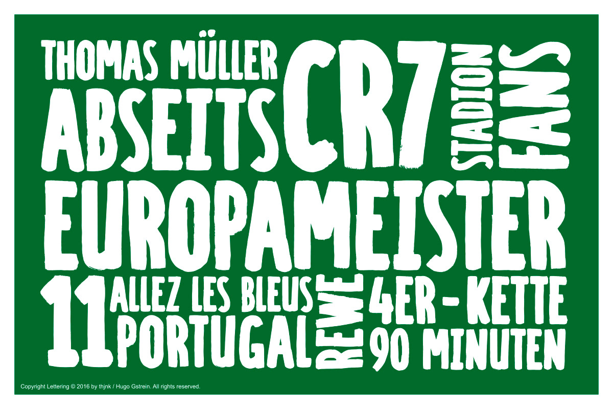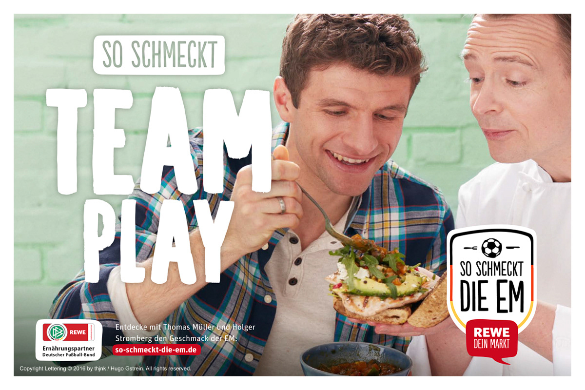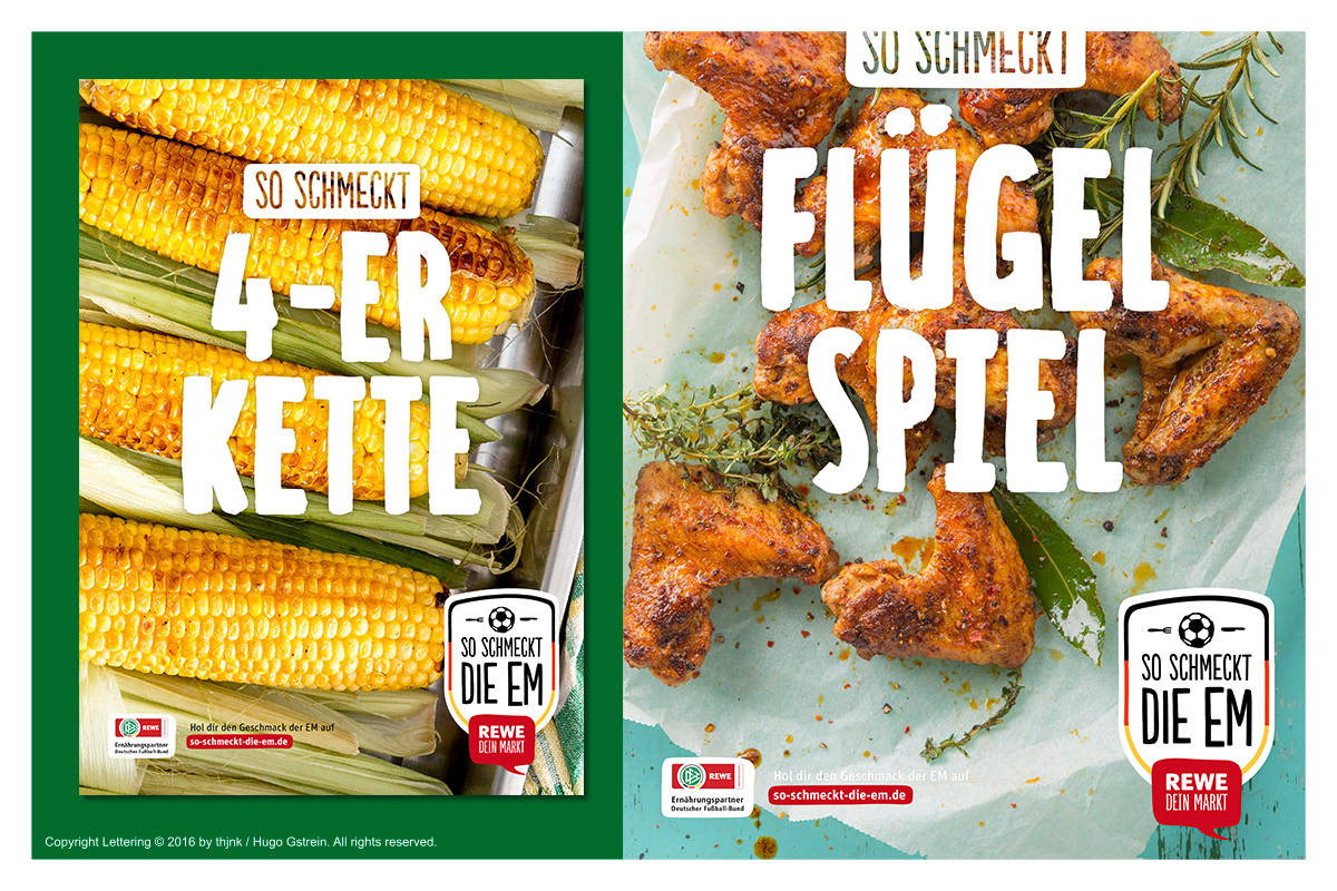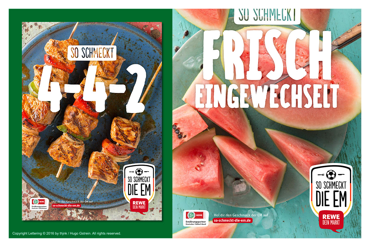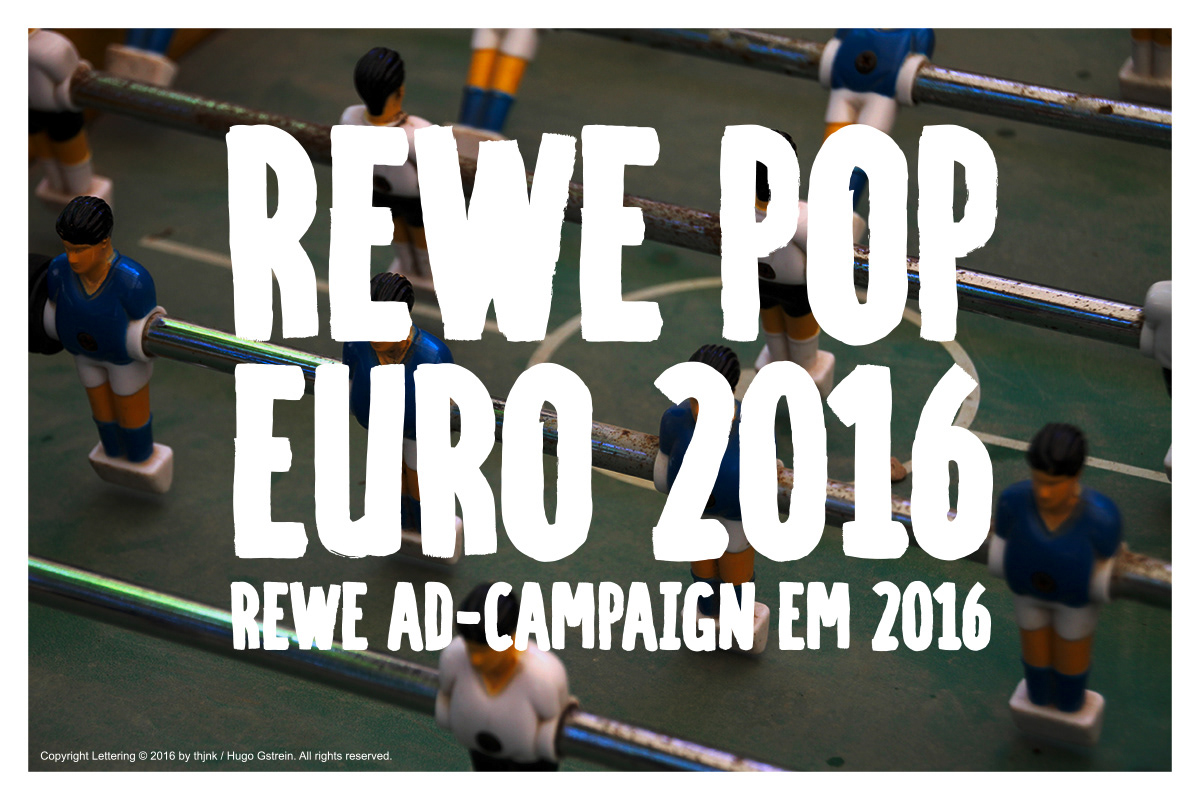Rewe commissioned us to develop a headline typeface for their advertising campaign launched during the EURO 2016. The characters were designed by thjnk / Hugo Gstrein and we developed the typeface. (Layout posters by thjnk)